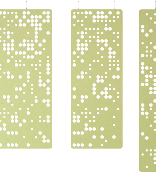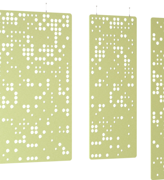 Afgeleid van het braille-alfabet, herinterpreteeren we deze taal met deze unieke akoestische roomdivider. Cirkelvormige perforaties vormen het ontwerp van deze geluidsabsorberende scheidingswand om de behoefte aan akoestische en visuele privacy perfect in evenwicht te brengen.