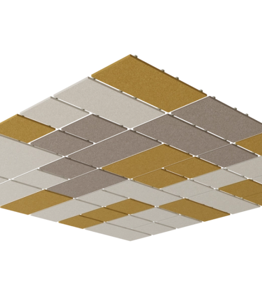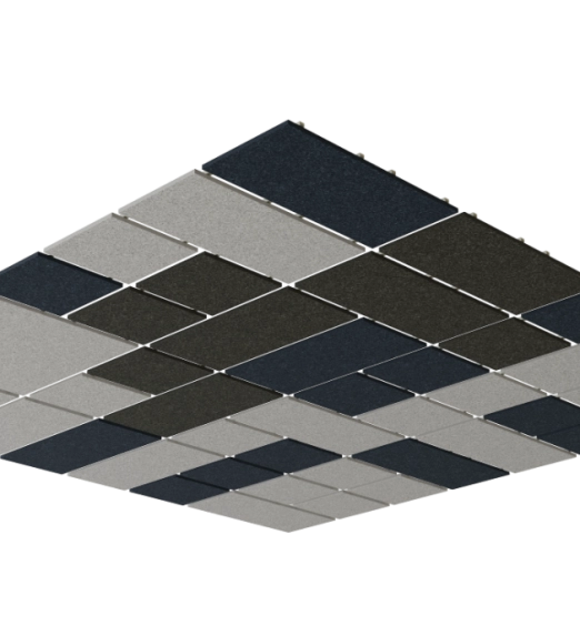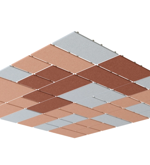 De kern van het ontwerp van Piet is het streven om afval van restmateriaal te verminderen, wat leidde tot een onderzoek naar tegelgeometrieën om het gebruik van onze 24 mm Archisonic pet felt panelen te optimaliseren. Door dit innovatieve proces ontstonden drie verschillende tegelvormen: twee vierkanten van verschillende afmetingen en één rechthoek. Deze tegels kunnen in acht unieke clusters worden gerangschikt, elk met dezelfde buitenafmetingen, waardoor ze naadloos in een open raster kunnen worden geplaatst.