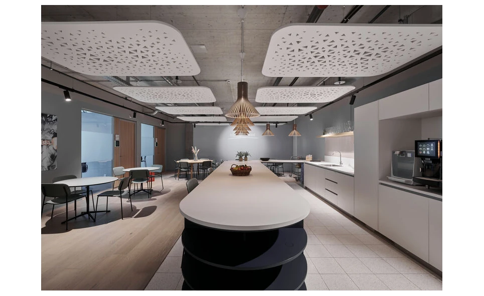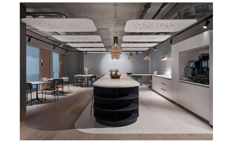 Een interessante herinterpretatie van het bekende en compacte rechthoekige plafondpaneel. Met behoud van de originele afgeronde hoeken, subtiele afwerking en akoestische kwaliteiten, heeft dit ontwerp een uitgesneden patroon dat doet denken aan een spinnenweb dat verrast en een lust voor het oog is.