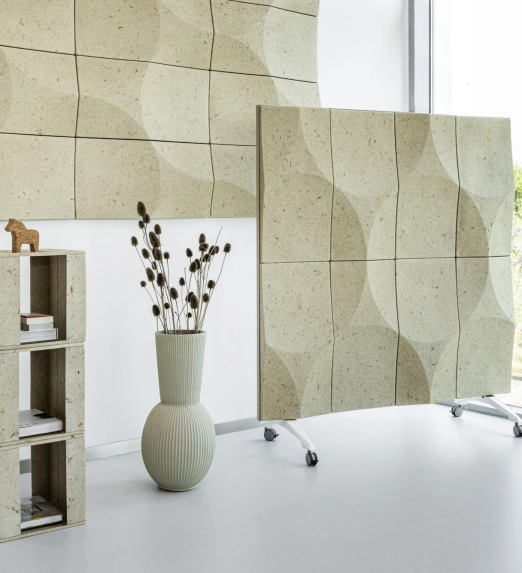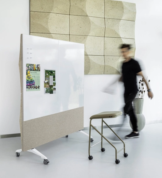 VANK_SCREEN akoestische dividers zijn een modern, visueel aantrekkelijk, mobiel hulpmiddel voor agile en creatieve teams. De scheidingswanden worden aangeboden in enkele of dubbele versies, vrijstaand op poten of als mobiele oplossing op wielen. Ze worden geleverd met akoestische panelen aan één zijde of aan beide zijden. De panelen zijn gemaakt van BIO composite, rPET of extra bekleed met stoffen om een vleugje kleur aan het interieur toe te voegen. De afgeronde ELLIPSE panelen vormen samen het GLOBE patroon.
