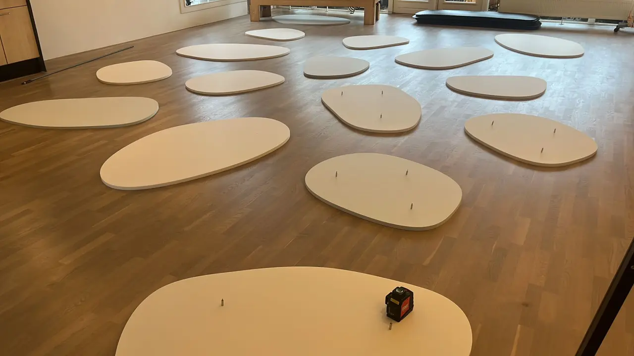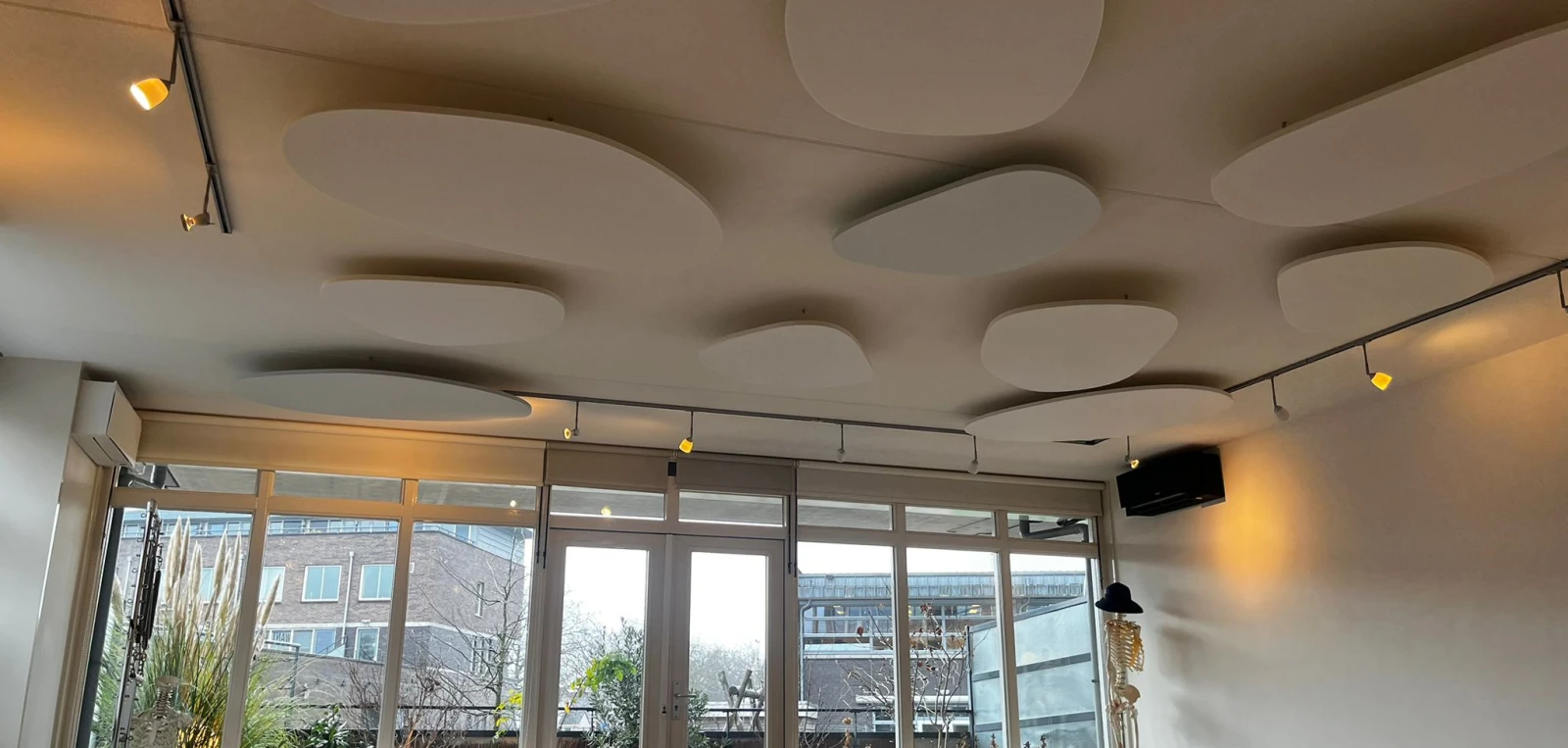 We hebben onze STONE akoestische plafondpanelen geïnstalleerd. Deze panelen dienen niet alleen als krachtige geluidsabsorber om galm tegen te gaan, maar voegen door hun unieke vormgeving ook een organisch element toe aan de ruimte.